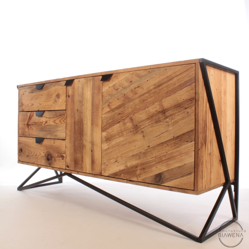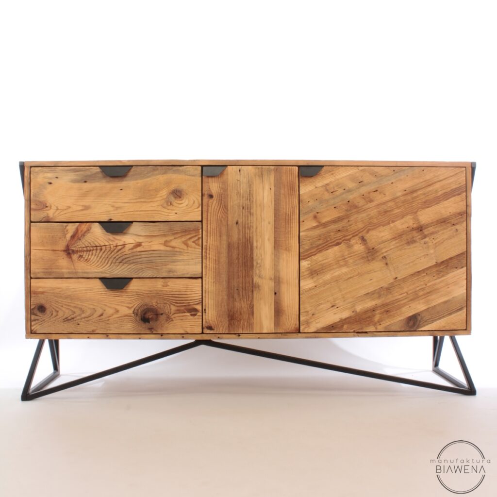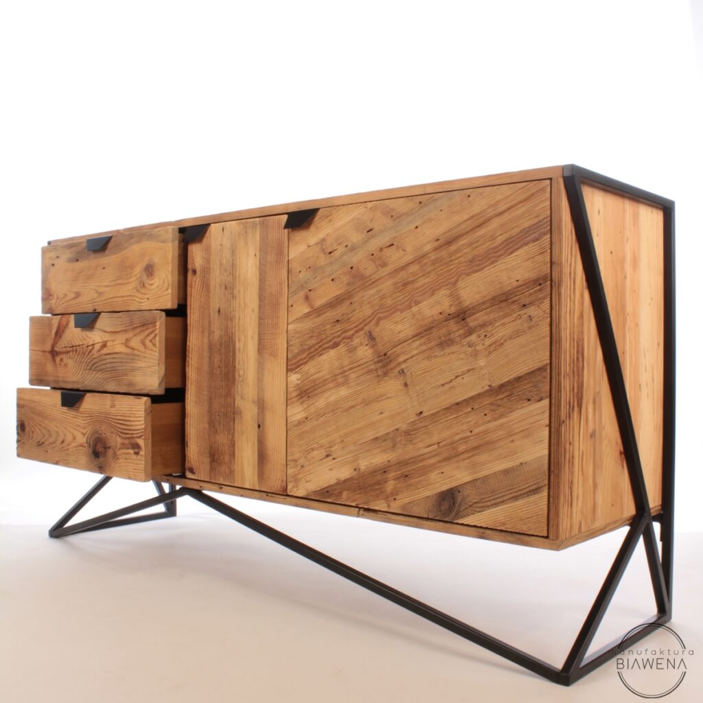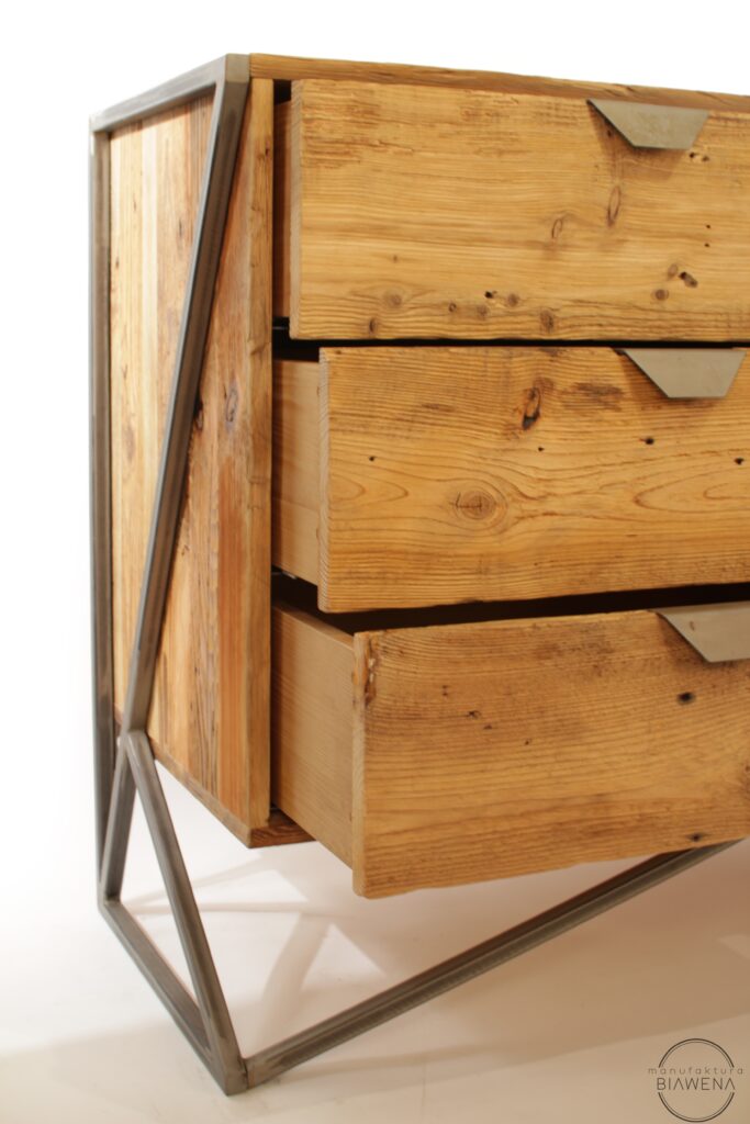 Komoda MOOLD to doskonały wybór dla osób ceniących styl industrialny, naturalne materiały i praktyczne rozwiązania. Jej unikalny design przyciąga wzrok, łącząc ciepło upcyklingowanego drewna z surowością stalowego stelaża, który podkreśla nowoczesny charakter mebla i zapewnia jego trwałość. To idealny element wystroju, który nada każdemu wnętrzu niepowtarzalnego stylu – od loftowych apartamentów po bardziej klasyczne aranżacje.