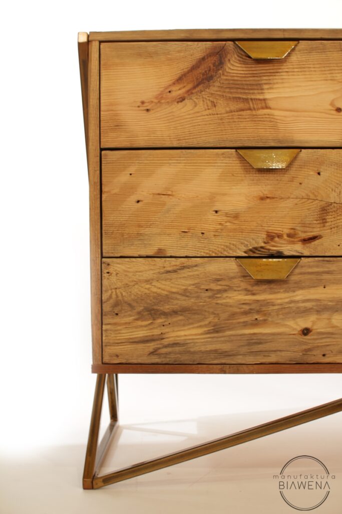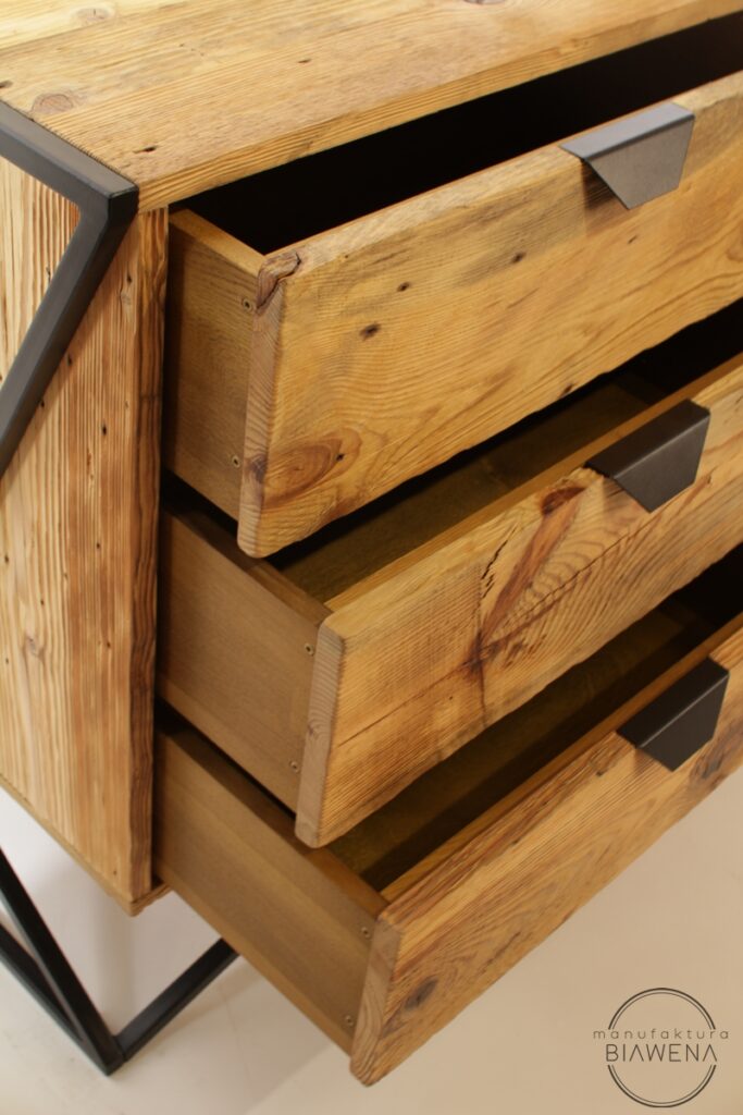 Solidna konstrukcja i wysokiej jakości materiały to gwarancja długowieczności. Stalowy stelaż o profilu 20x20x2 mm, malowany lakierem proszkowym, chroni mebel przed uszkodzeniami i korozją, czyniąc go odpornym na intensywne użytkowanie. Korpus z litego drewna sosnowego, olejowanego natryskowo, nie tylko prezentuje się elegancko, ale również jest łatwy w pielęgnacji, dzięki czemu komoda zachowa swój wyjątkowy wygląd na długie lata.